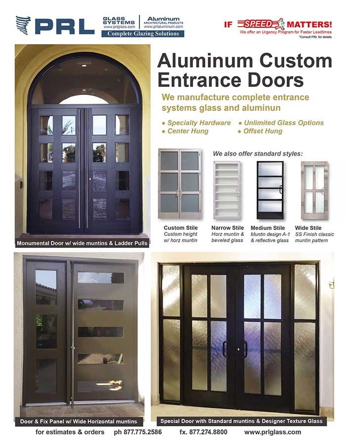 Find awe-inspiring custom entry doors for your glass and aluminum storefront at PRL of Los Angeles County. Commercial or residential, we create an unlimited range of decorative door designs. Manufacturing all aluminum extrusions and brake metal in-house, we can render everything from wide horizontal muntins and customized vertical grids to single or double doors with aluminum infill panels. Offered in oversizes as well as 2” narrow, 3 ½” medium and 5” wide stiles, our custom entry doors will take your breath away. Call us today to design the front ingress way you deserve!